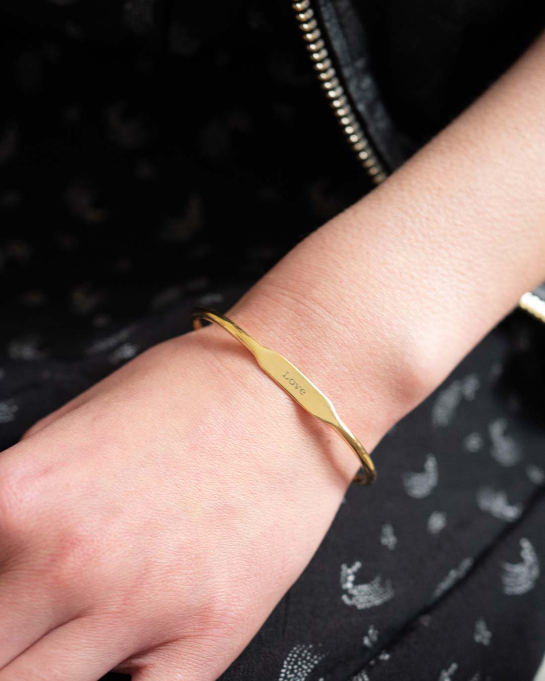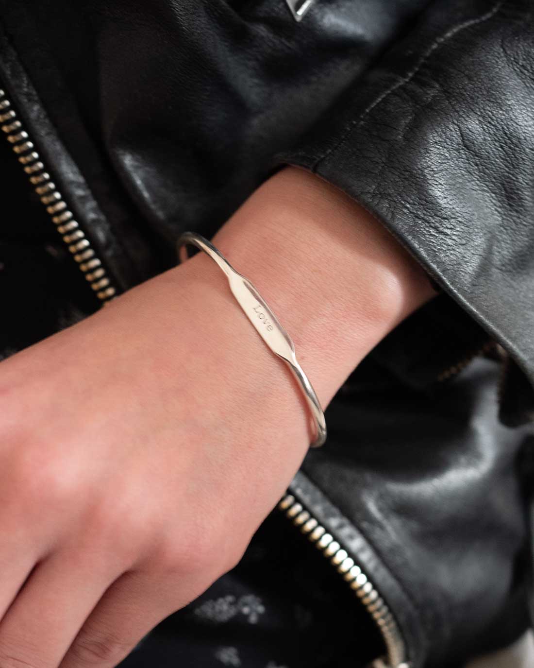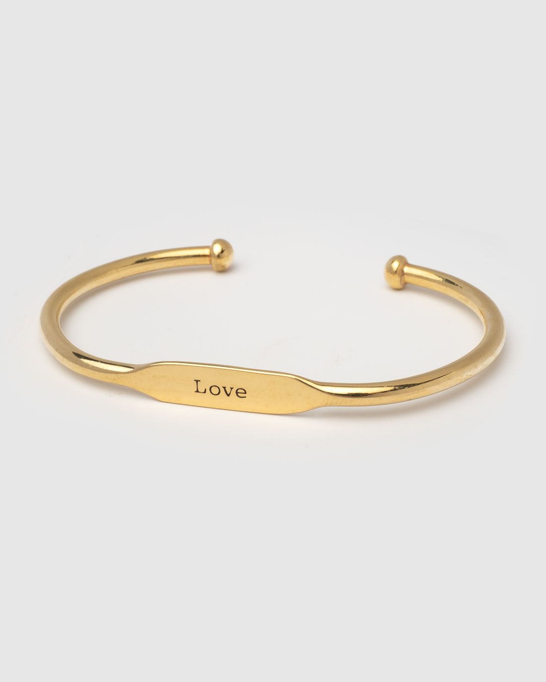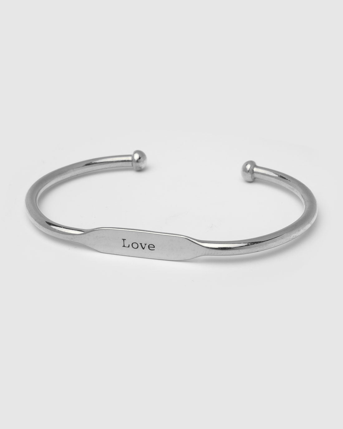 Armspange Love von Anna + Nina. Handgemacht, flaches Mittelstück mit Love Gravur. Die Größe der Armspange kann durch vorsichtiges Biegen angepasst werden.