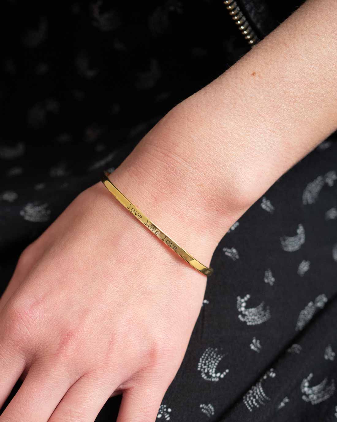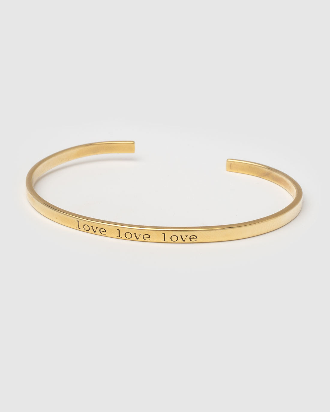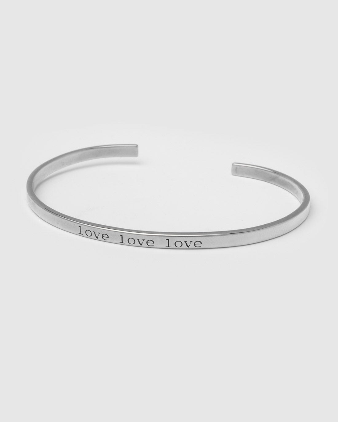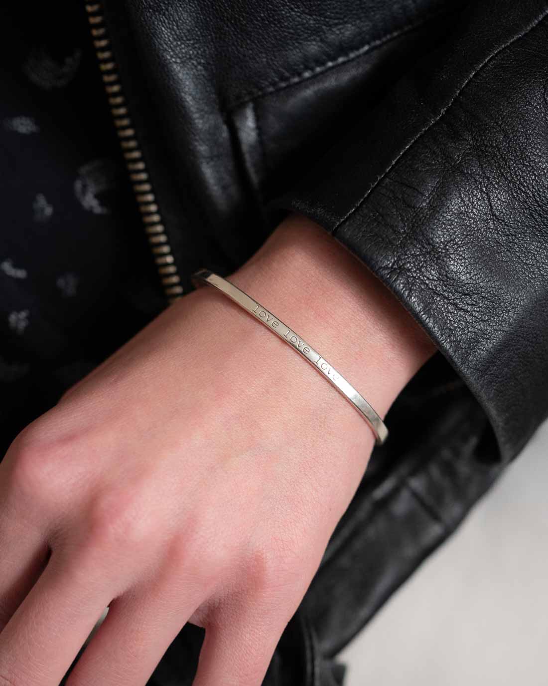 Handgefertigte Armspange von Anna + Nina. "love, love, love" Gravur. Die Größe der Armspange kann durch vorsichtiges Biegen angepasst werden.