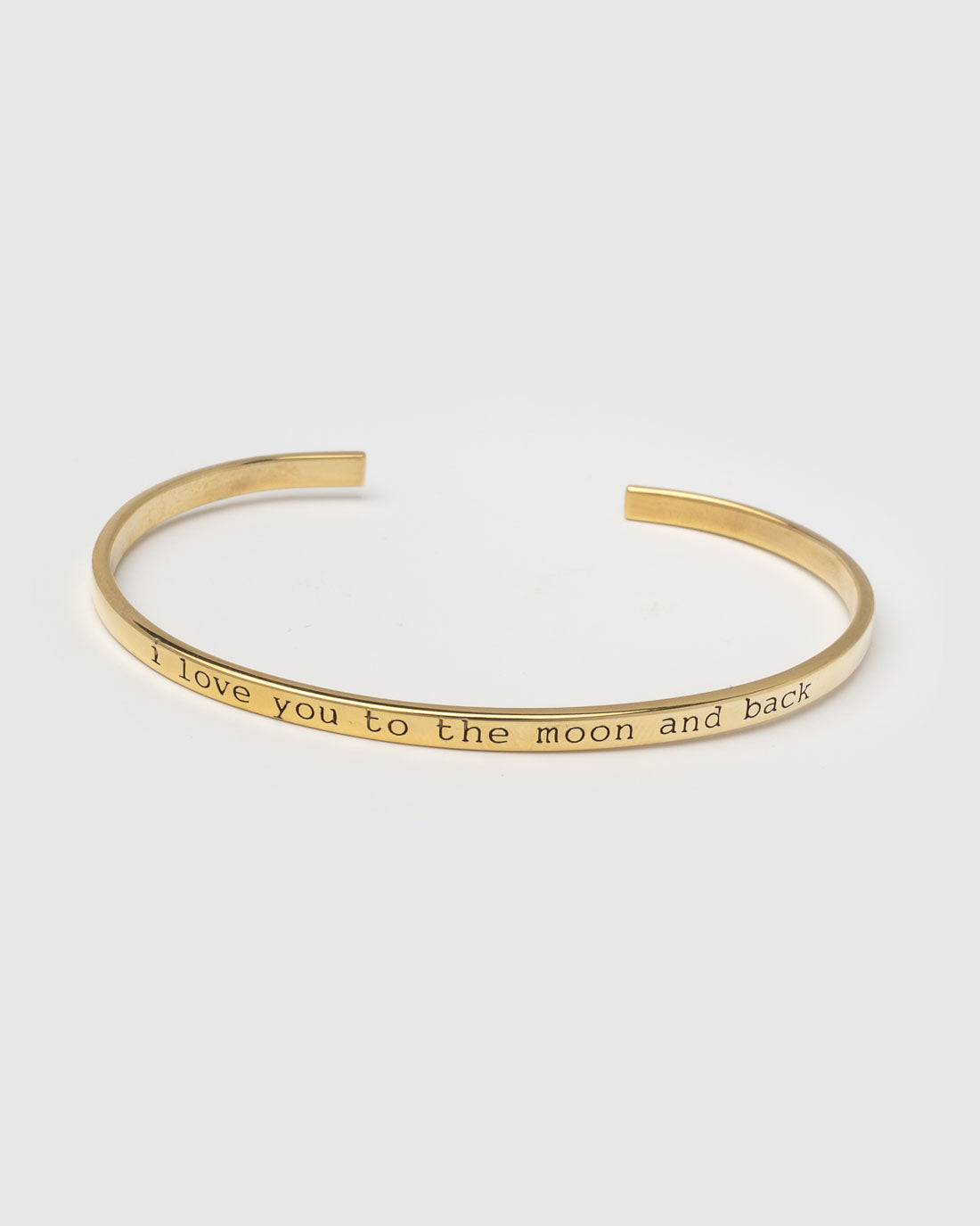 Vergoldete, handgefertigte Armspange von Anna + Nina. "I love you to the moon and back" Gravur. Die Größe der Armspange kann durch vorsichtiges Biegen angepasst werden.