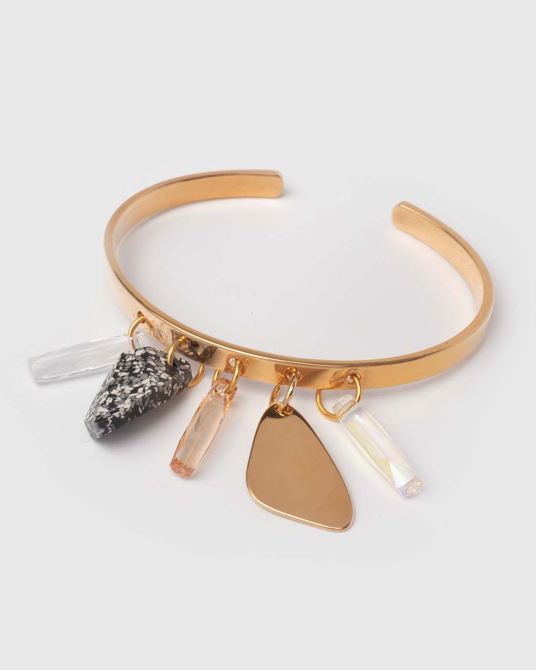 Vergoldeter Armreif Lucky Charm Black mit Marmor Anhänger und vier weiteren Charms von Malaika Raiss. Der Armreif ist hochwertig vergoldet.
