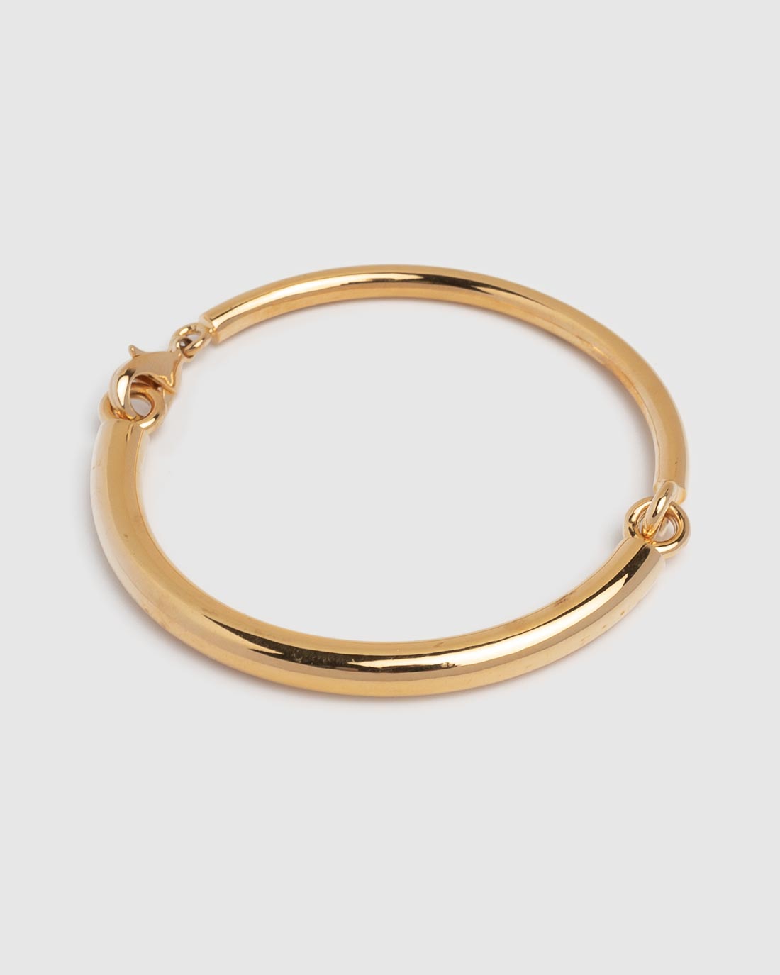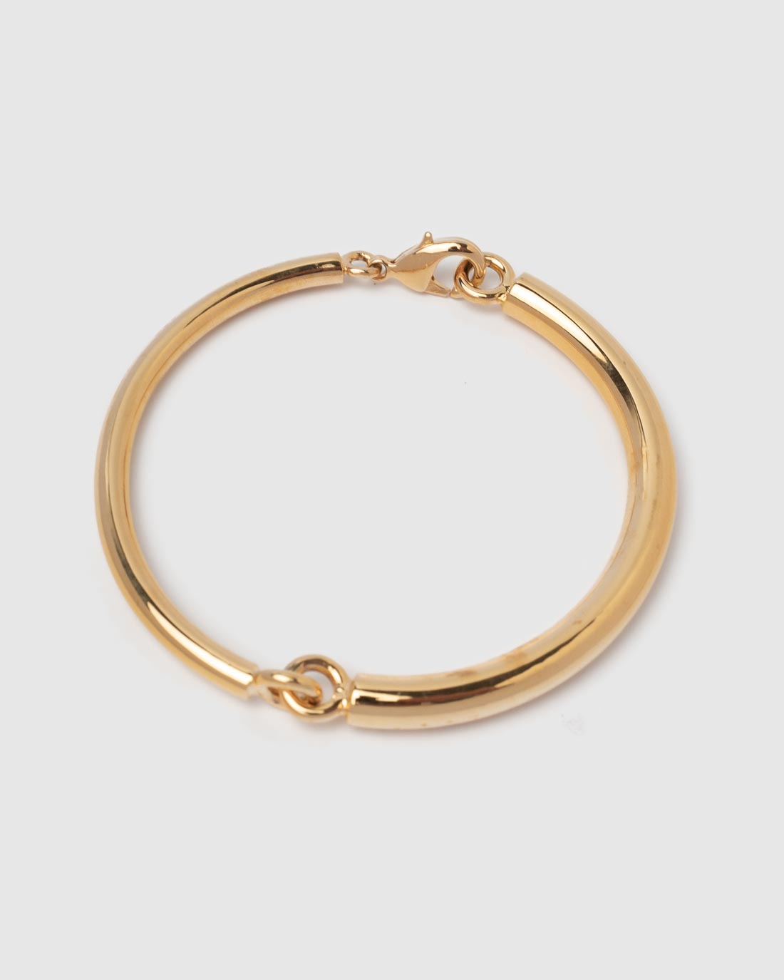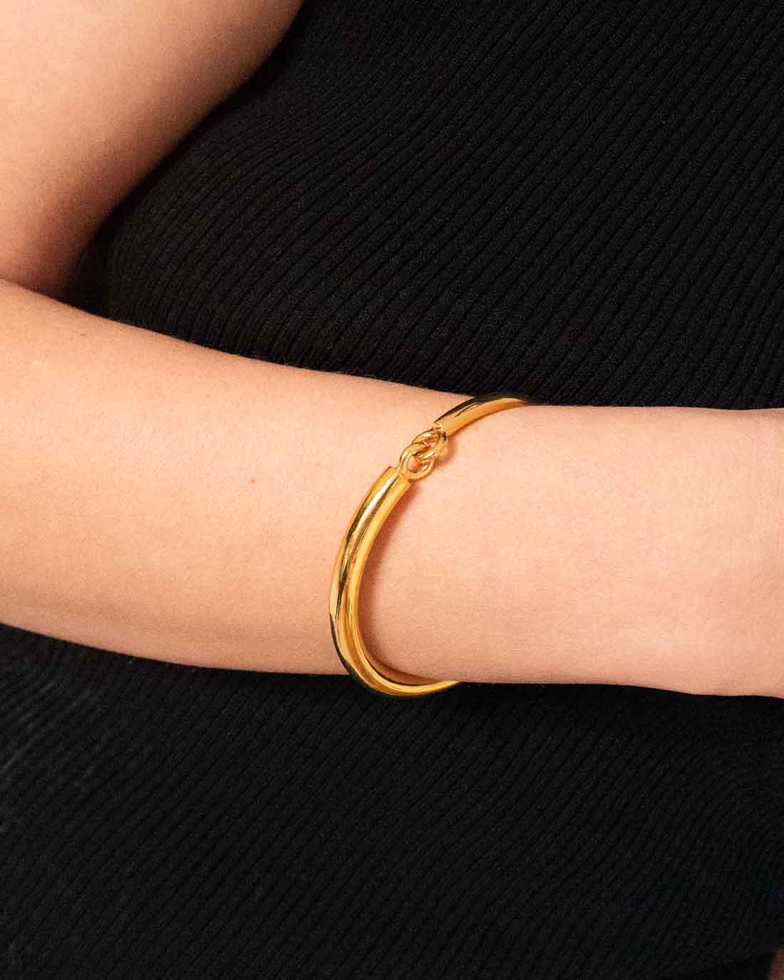 Goldener Klapparmreif von Sabrina Dehoff. Die beiden Hälften des Armreifs werden mit einem Karabinerverschluss geschlossen.