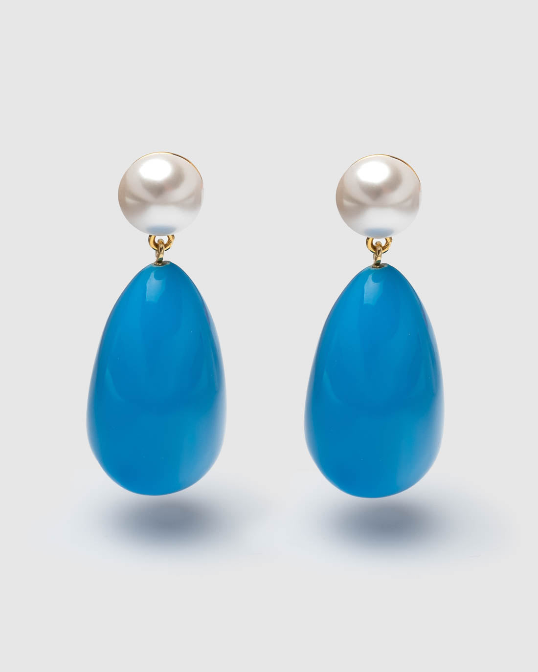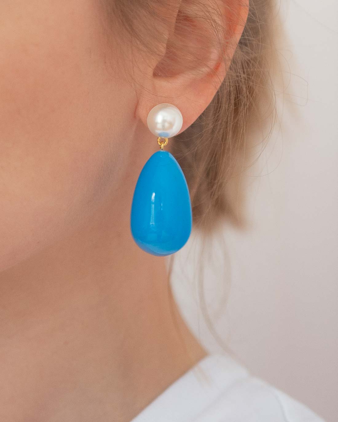Ohrringe mit blauem Anhänger, Perle und Emaille aus vergoldetem Sterlingsilber. Die Ohrringe sind trotz ihrer Größe angenehm leicht zu tragen.