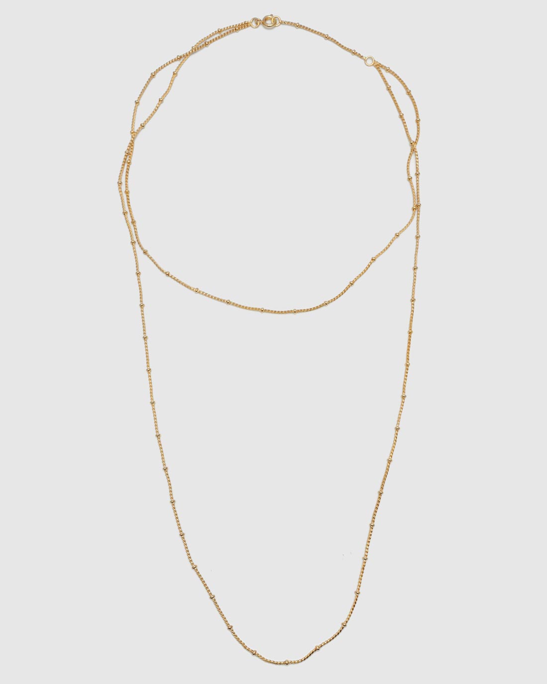 Vergoldete Halskette Double Necklace Stardust von der Designerin Malaika Raiss. Die Besonderheit der Kette besteht in der zarten Ankerkette und den aufgereihten vergoldeten Perlen. Die Kette wird doppelt getragen, kann aber auch einzeln getragen werden. Kette und Anhänger sind hochwertig vergoldet.