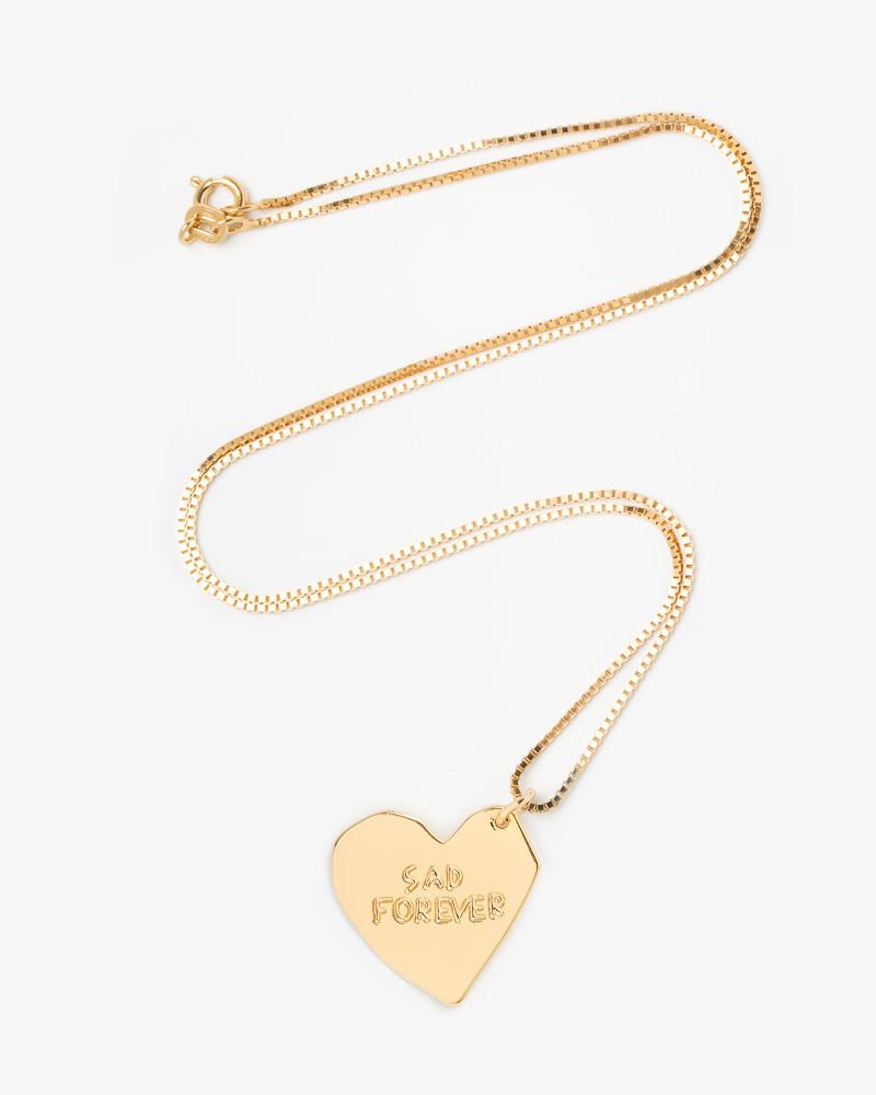 Vergoldete Halskette vom Berliner Designerlabel Malaika Raiss mit graviertem Sad Forever Herz-Anhänger. Venezianerkette mit Federring -Verschluss. Kette und Anhänger sind hochwertig vergoldet.